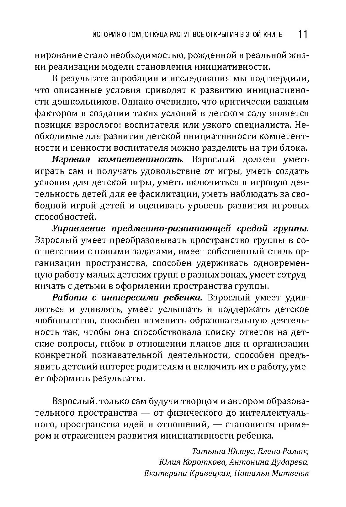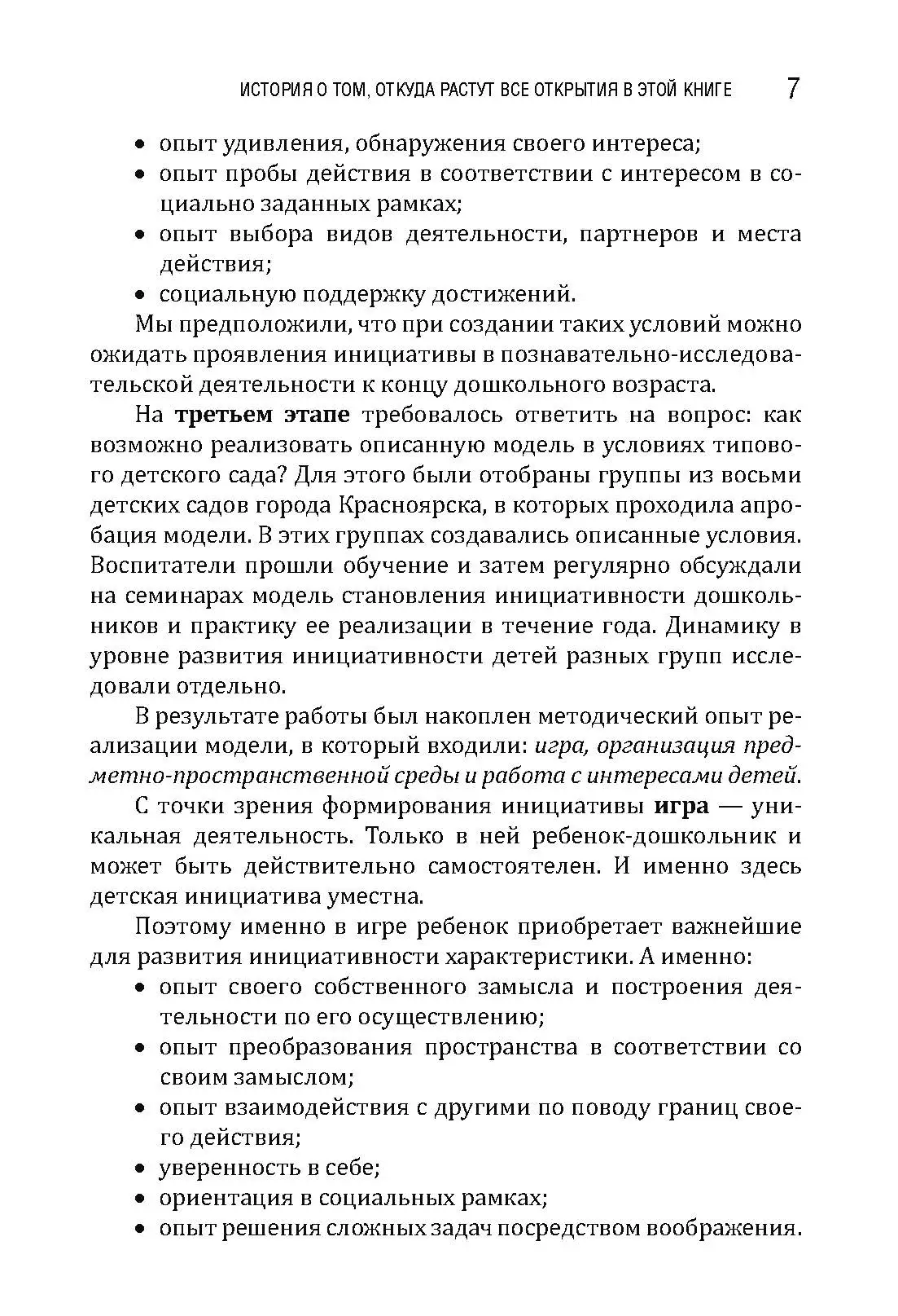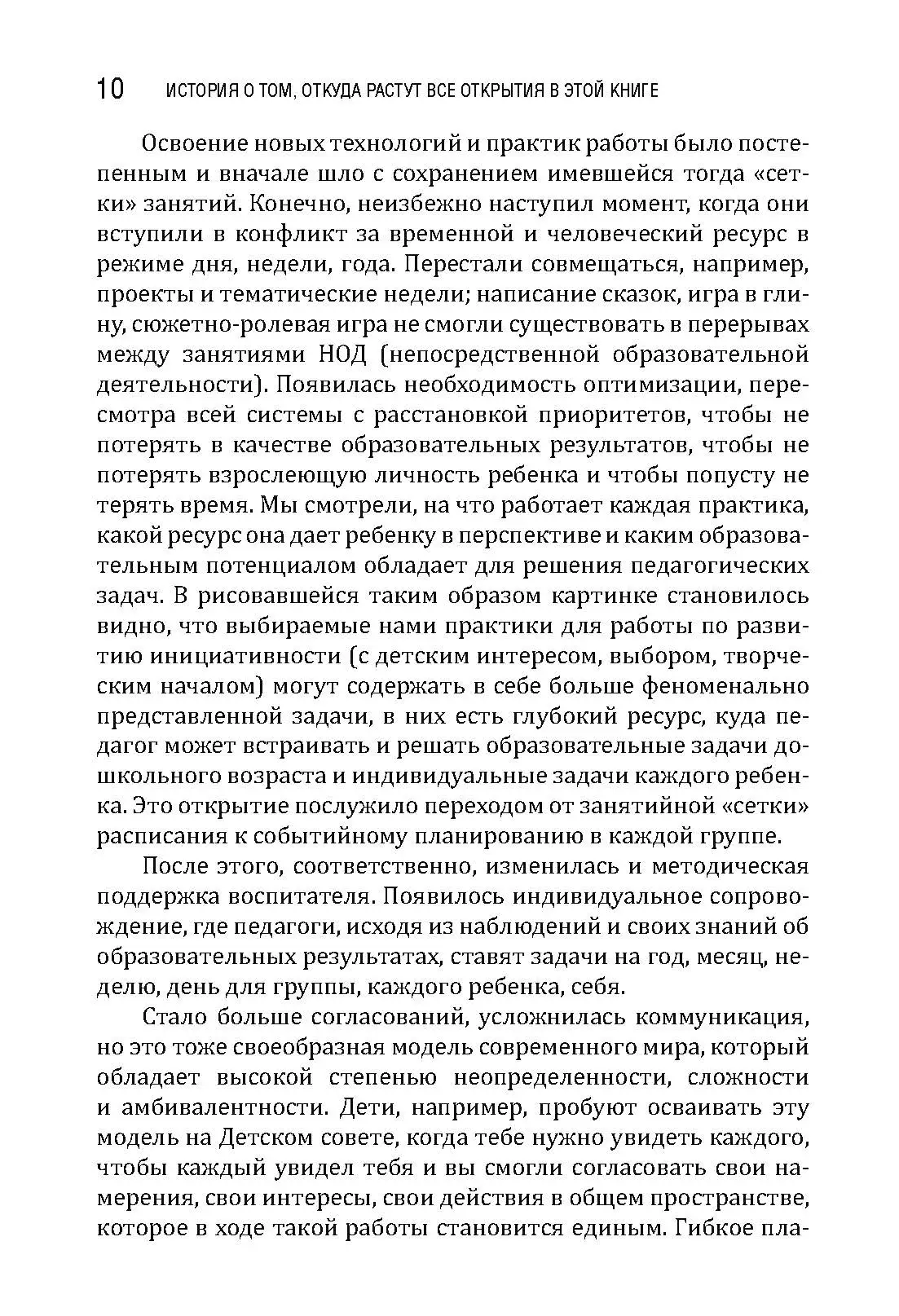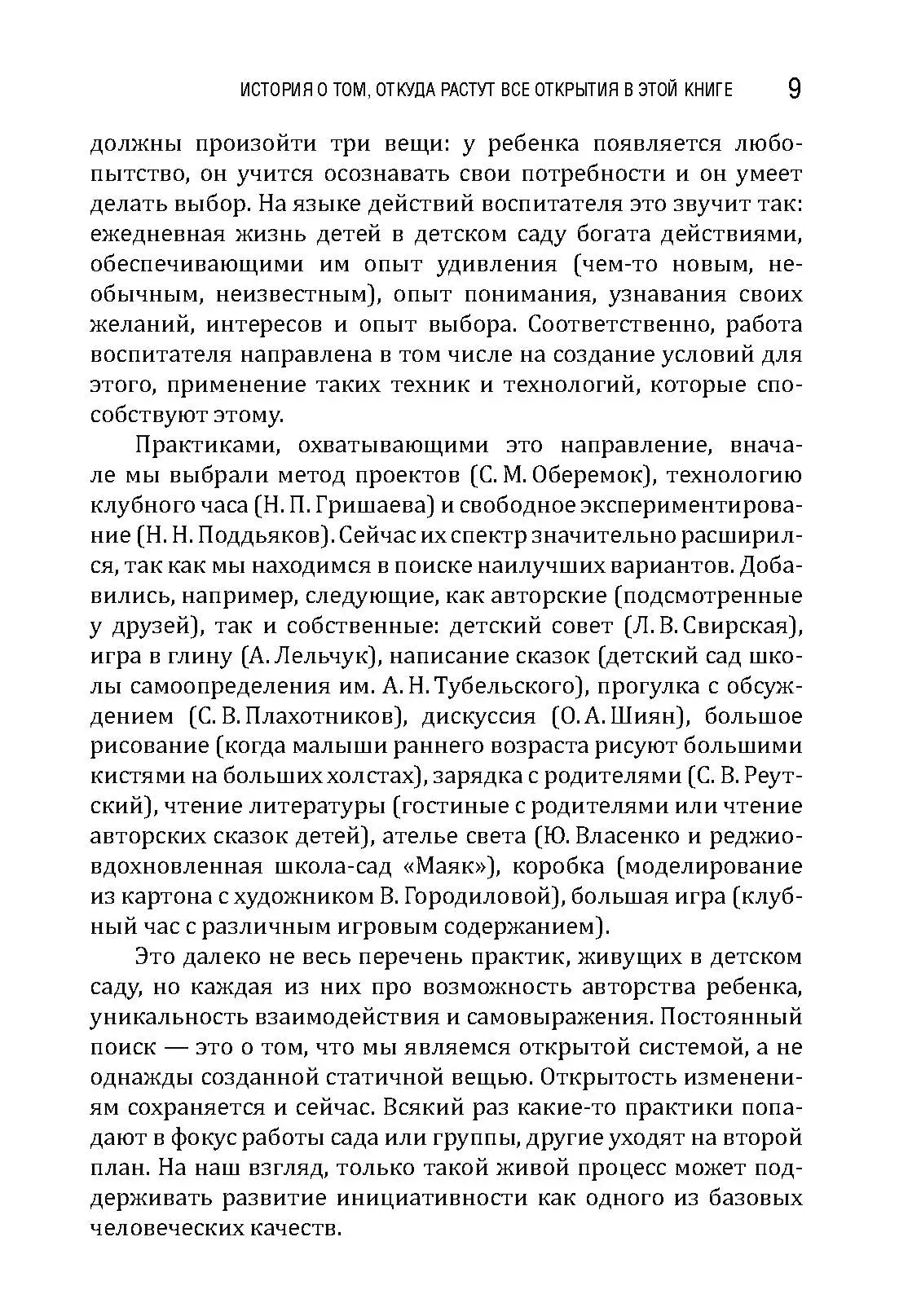 Книга представляет собой сборник историй из практики детского сада на пути создания условий для настоящего детства и настоящих живых встреч взрослого и ребенка в обычном муниципальном саду. Она будет интересна как практикам дошкольного образования, так и экспертам в качестве примеров иллюстраций реализации разных технологий работы с детьми с фокусом на субъектность детей и взрослых. Истории разноплановые и позволяют посмотреть на обычную жизнь в детском саду во всем ее объеме, разглядеть развивающий потенциал простых ситуаций, задуматься о разнообразии действий взрослых и эффектах от этих действий. Педагоги-дошкольники смогут почерпнуть в книге конкретные идеи для работы, а главное — вдохновиться и снова поверить, что их действия имеют огромное значение для развития детей, для всей их жизни, а значит, и для нашего общего будущего.
