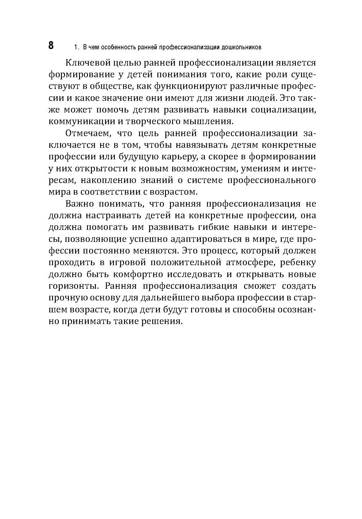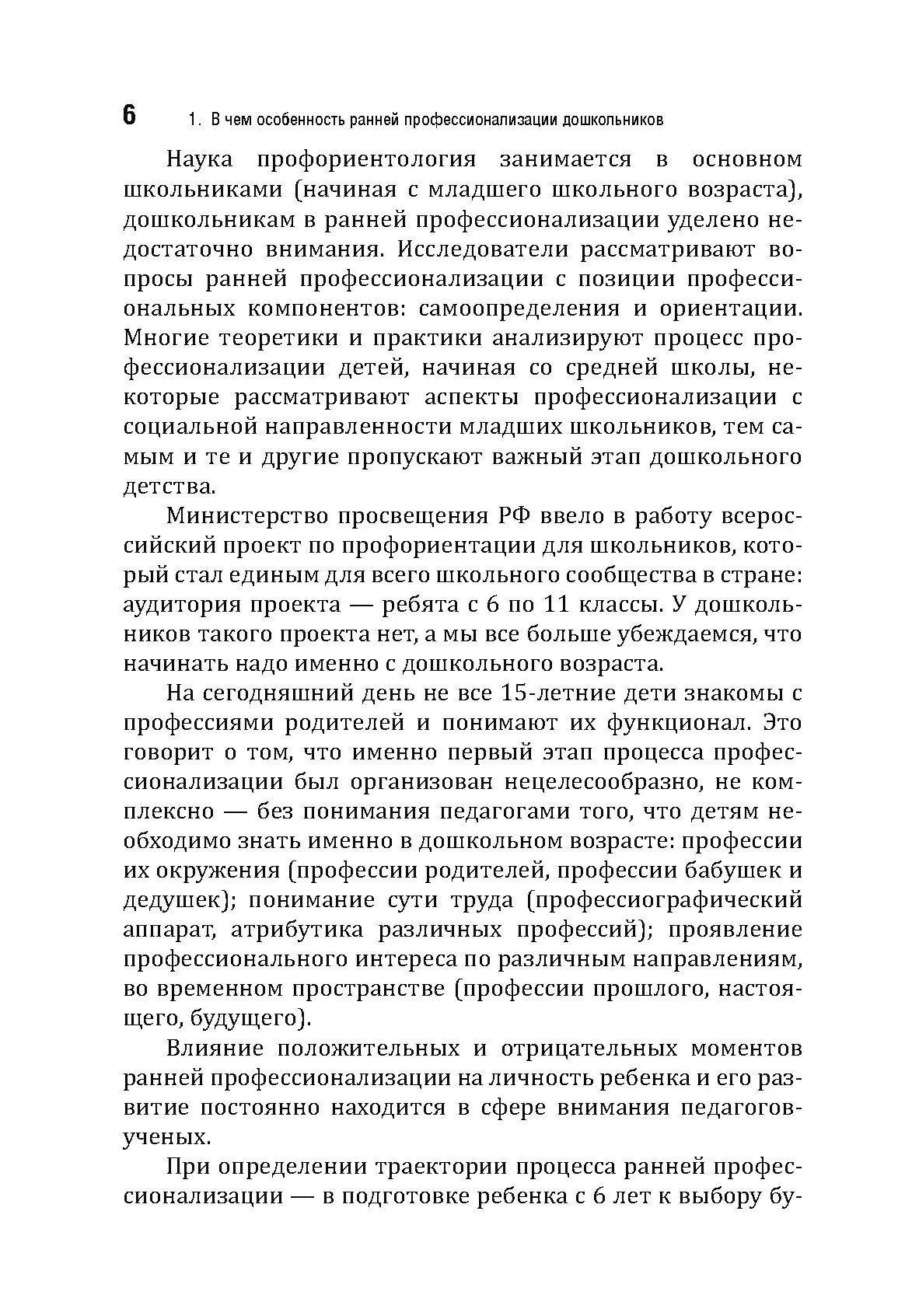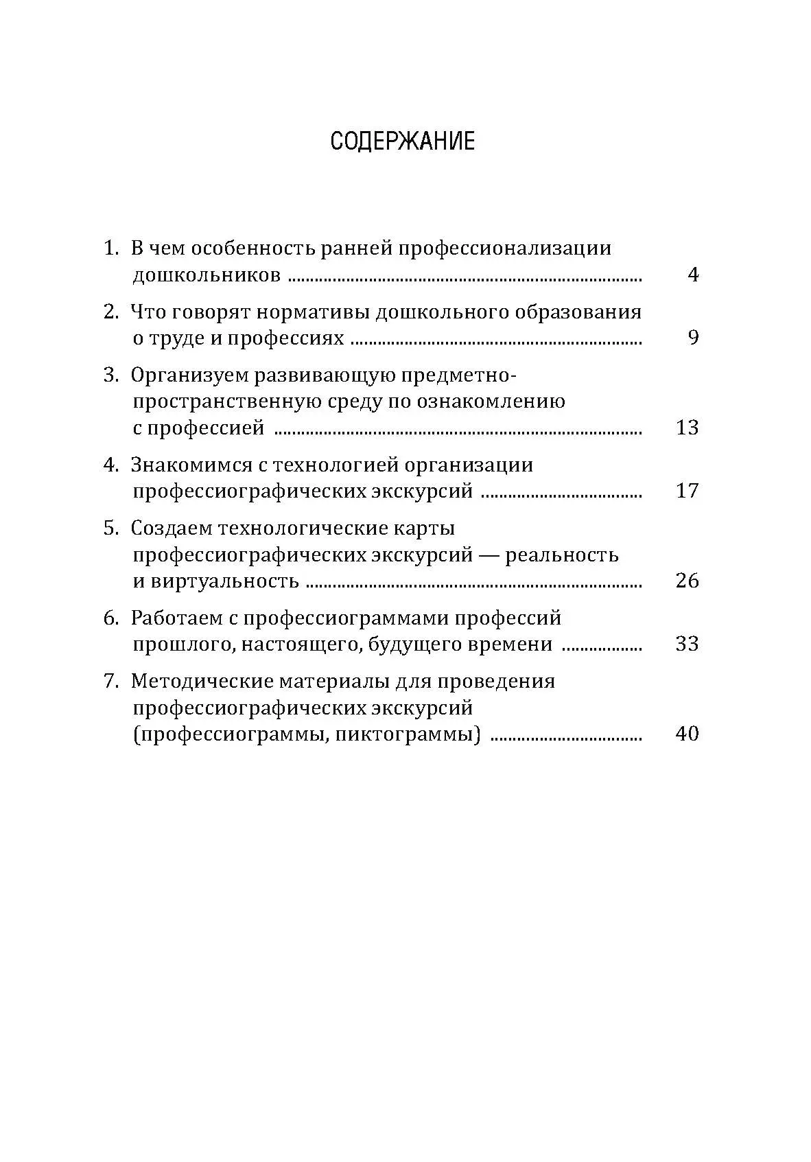 Учебно-методическое пособие «Ранняя профессионализация дошкольников: Экскурсия в профессию» соответствует ФГОС ДО (Приказ Министерства образования и науки РФ от 17 октября 2013 г. № 1155) и ФОП ДО (Приказ Министерства просвещения РФ от 25 ноября 2022 г. № 1028), предусматривает изучение учебного и методического материала в порядке согласно содержанию, которое раскрывает тему ранней профессионализации дошкольников, развивающей предметно-пространственной среды по ознакомлению с профессиями, предлагает технологию организации профессиографических экскурсий, применение технологических карт в образовательной работе дошкольной образовательной организации.