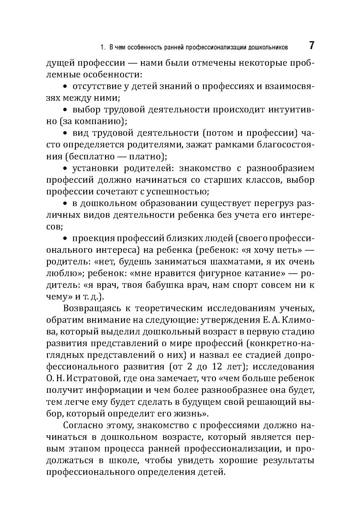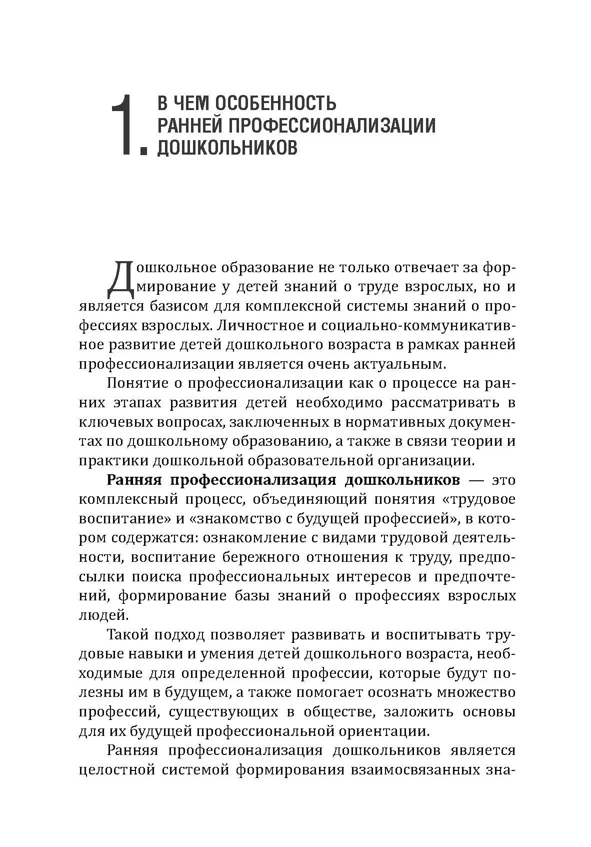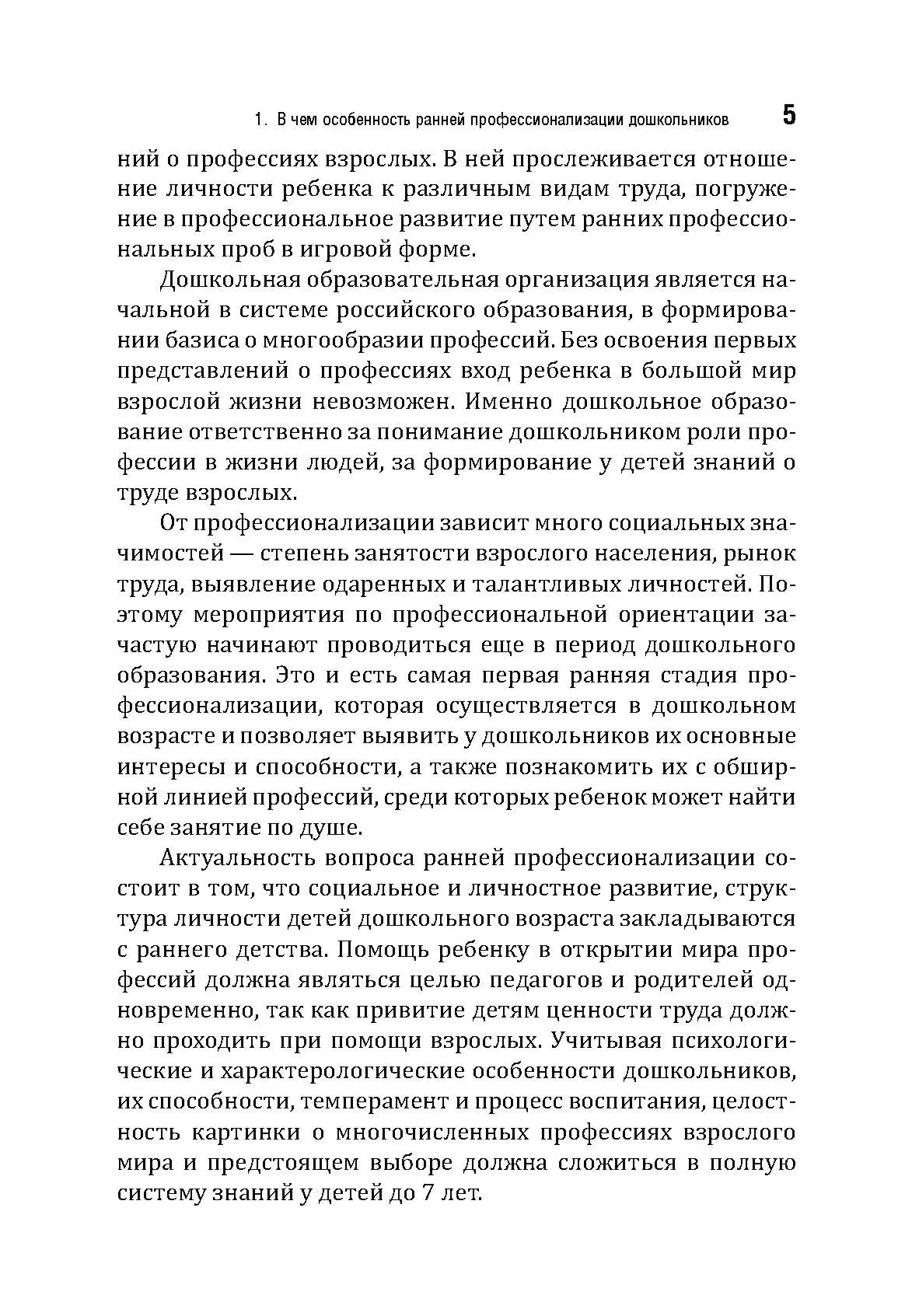 Учебно-методическое пособие «Ранняя профессионализация дошкольников: Экскурсия в профессию» соответствует ФГОС ДО (Приказ Министерства образования и науки РФ от 17 октября 2013 г. № 1155) и ФОП ДО (Приказ Министерства просвещения РФ от 25 ноября 2022 г. № 1028), предусматривает изучение учебного и методического материала в порядке согласно содержанию, которое раскрывает тему ранней профессионализации дошкольников, развивающей предметно-пространственной среды по ознакомлению с профессиями, предлагает технологию организации профессиографических экскурсий, применение технологических карт в образовательной работе дошкольной образовательной организации.